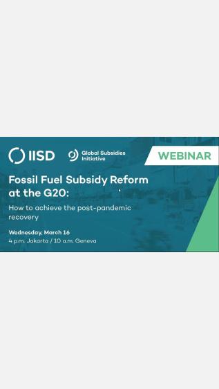 On Wednesday, 16 March at 4PM WIB (10AM CET), IISD's Global Subsidies Initiative will host Fossil Fuel Subsidy Reform at the G20: How to achieve the post-pandemic recovery