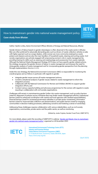 A case study from Bhutan on "How to Mainstream Gender into National Waste Management Policy" presented by Sachin Limbu, Senior Environment Officer, Ministry of Energy and Natural Resources, Bhutan at UNEP-IETC organized webinar on gender and waste management policy on 28 November 2023.