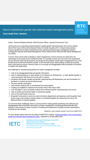 A case study from Jamaica on "How to Mainstream Gender into National Waste Management Policy" presented by Theresa Rodriguez-Moodie, Chief Executive Officer, Jamaica Environment Trust at UNEP-IETC's webinar on gender and waste management policy on 28 November 2023.