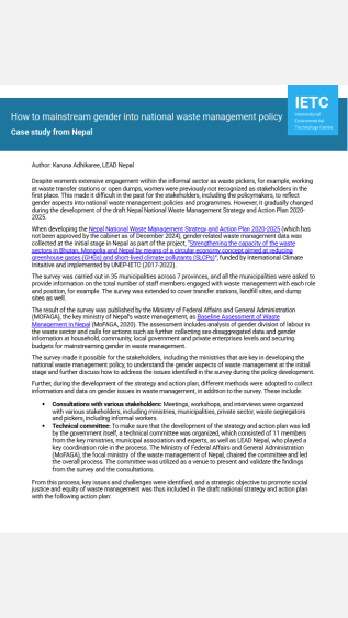 A case study from Nepal on "How to Mainstream Gender into National Waste Management Policy" presented by Karuna Adhikaree, LEAD Nepal at UNEP-IETC's webinar on gender and waste management policy on 28 November 2023.