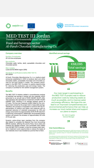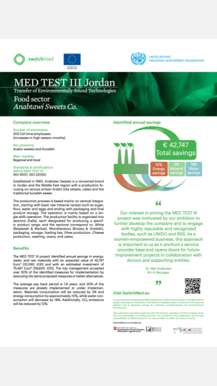 This case study describes the economic and environmental advantages of implementing resource-efficient and cleaner production practices in a Jordanian sweets factory using the UNIDO TEST methodology.