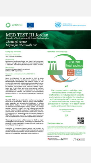 This case study outlines the economic and environmental benefits of implementing resource-efficient and cleaner production practices in a Jordan company producing cleaning and cosmetic products, using the UNIDO TEST methodology.