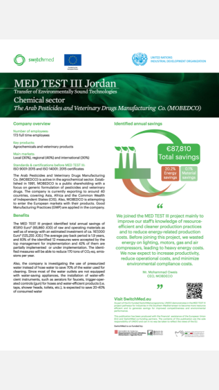 This case study outlines the economic and environmental benefits of implementing resource-efficient and cleaner production practices in a Jordan company producing agrochemicals and veterinary products, using the UNIDO TEST methodology.