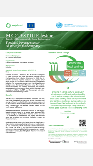 This case study demonstrates the economic and environmental advantages of implementing resource-efficient and cleaner production practices in a Palestinian producer of concentrated syrups and dry powder products, utilizing the UNIDO TEST methodology.