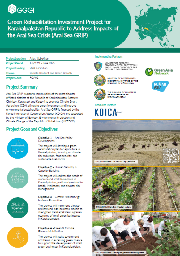 Funded by the Korea International Cooperation Agency (KOICA), the Global Green Growth Institute (GGGI) will implement in Uzbekistan the ‘Green Rehabilitation Investment Project for Karakalpakstan Republic to address impacts of the Aral Sea crisis’. The project aims to assist the green rehabilitation of the Republic of Karakalpakstan in addressing the impacts of the Aral Sea ecological crisis. The project will establish viable measures to allow communities of the most disaster afflicted districts to pursue disaster resilient sustainable livelihoods through climate-resilient agri-business models. It will also provide the policy, financing, and investment frameworks to allow these to be scaled up. The project will support disaster-risk reduction, improve food security, and enhance livelihoods and job creation in an integrated approach by integrating the dissemination of well-established climate smart agriculture techniques that will increase yields with support for enabling environments for emergence of climate resilient farmers and MSMEs.