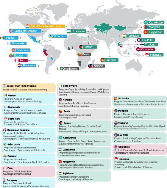 In 2023, with financial support from the Luxembourg government, GGGI established the Global Trust Fund (GTF), a four-year programme to accelerate the adoption of sustainable financial instruments, including thematic bonds and debt-for-nature swaps, in developing countries. This program aims to improve sustainable finance in emerging economies by enhancing policy frameworks, strengthening national green finance ecosystems, and building the capacity of market participants. It facilitates the issuance of thematic bonds by providing key policy support, technical assistance, and guidance to beneficiaries from developing countries.
