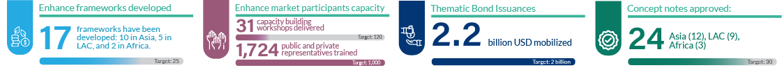 The GTF strengthens the national green finance ecosystems of at least 22 developing countries in Asia, Africa, and Latin America and the Caribbean, prioritized by the GTF Board. This is achieved through the development of 17 policy frameworks and the training of more than 1,700 sustainable finance experts across the public and private sectors. The Global Trust Fund provides pre- and post-issuance support, as well as credit enhancement, to potential issuers, resulting in 10 thematic bond issuances that have raised USD 2.2 billion toward nationally determined contributions (NDC) targets. Direct capital mobilization through the Trust Fund will help avoid 130 million tCO₂ emissions, strengthen the climate resilience of 2 million beneficiaries, and create 400,000 green jobs.
