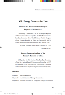 The Energy Conservation Law was adopted at the 28th Session of the Standing Committee of the 8th National People's Congress on November 1, 1977, and amended at the 30th Session of the Standing Committee of the 10th National People's Congress on October 28, 2007. It provides information on general provisions, administration of energy conservation, rational utilization of energy and energy conservation, energy conservation technology advancement, incentive measures, legal liabilities, and supplementary provisions. Chapter "Rational utilization of energy and energy conservation" is divided into six sections that provide the general rules and specific rules for the conservation of energy in various sectors namely industry, construction, transport, public institutions, and key energy consumption units respectively.