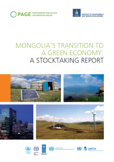This Mongolia’s Transition to a Green Economy: A Stocktaking Report, produced by the Ministry of Environment and Green Development of Mongolia with the support of the Partnership for Action on Green Economy (PAGE), analyses Mongolia's progress towards a green economy, taking stock of relevant policies and initiatives, and identifies the major actors who will drive a green economy transition. The report identifies opportunities for the international community to assist Mongolia to transform its economy. Findings from this research suggest that the key priority sectors for the PAGE project and the development of a green economy in Mongolia should be: agriculture, mining and renewable energy. Although other sectors, such as transport, waste treatment and tourism will be important for Mongolia’s development, agriculture and mining are the country’s largest economic sectors, while renewable energy has considerable potential for its future.