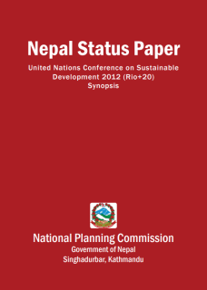 Nepal Status Paper: United Nations Conference on Sustainable Development 2012 (Rio+20) synopsis is a process-driven document and an outcome of discussions and deliberations among civil society, government and non-government stakeholders, parliamentarians and local communities. The findings suggest that Nepal has made significant progress on the policy, legislation and institutional aspects of sustainable development but has remained weak in implementation. There also have been positive achievements in implementing programs related to natural resources management, renewable energy, health and education, and poverty reduction. Nepal has comparative advantage in developing sustainable agriculture, tourism, renewable energy, nontimber forest products, community forestry and biodiversity conservation. It has also launched a global initiative to advocate for attention to the perilous situation in the mountains. Nepal needs additional international support in financing, technology transfer and capacity building, and special support for improving terms of trade and for assisting it to bolster its competitive advantage in agricultural product marketing.