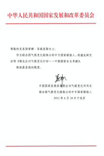 The Government of the People's Republic of China submitted its first nationally determined contribution (NDC) to the UNFCCC on 2 September 2016.