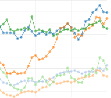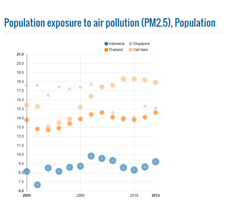 Bubble charts allow users to explore trends across two indicators over time. The y-axis measures the first indicator (e.g. population explore to air pollution) while the size of the bubbles captures the second indicator (e.g. population).