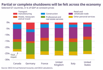 The impact effect of business closures could result in reductions of 15% or more in the level of output throughout the advanced economies and major emerging-market economies. In the median economy, output would decline by 25%.