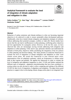 This study presents an analytical framework to evaluate the level of integration of climate mitigation and adaptation in cities’ local climate change action plans (CCAPs). This framework was tested in nine selected major cities that are frontrunners in climate action, both in their regions and globally. The framework was applied in order to evaluate the level of mitigation and adaptation integration in cities’ CCAPs and further explored the different types of mitigation-adaptation interrelationships.