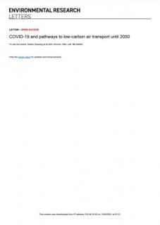 The COVID-19 pandemic has led to an unprecedented decline in global air transport and associated reduction in CO2 emissions. The International Civil Aviation Organization (ICAO) reacted by weakening its own CO2-offsetting rules. This study investigates whether the pandemic can be an opportunity to bring the sector on a reliable low-carbon trajectory, with a starting point in the observed reduction in air transport demand. It models a COVID-19 recovery based on a feed-in quota for non-biogenic synthetic fuels that will decarbonize fuels by 2050, as well as a carbon price to account for negative externalities and as an incentive to increase fuel efficiency. Results suggest that until 2050, air transport demand will continue to grow, albeit slower than in ICAO’s recovery scenarios, exceeding 2018 demand by 3.7–10.3 trillion RPK. Results show that synthetic fuels, produced by 14–20 EJ of photovoltaic energy, would make it possible to completely phase out fossil fuels and to avoid emissions of up to 26.5 Gt CO2 over the period 2022–2050.