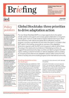 In this briefing, IIED provides an overview of the adaptation dimensions required under the GST and of progress to date to define these. Focusing on the needs and circumstances of developing countries, IIED suggests three practical priority steps countries can take to prepare their GST inputs: creating a coherent narrative on national adaptation actions, building an inclusive process that ensures adaptation actions reflect voices from the whole of society, and communicating progress to the international community.