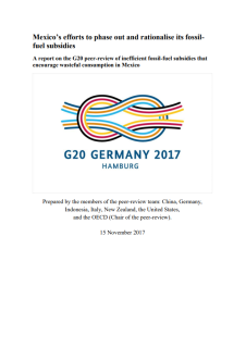 This report Mexico’s efforts to phase out and rationalise its fossilfuel subsidies is an outcome of this peer-review process, providing a succinct account of the discussions that took place between Mexican officials and the review team, but also within the review team itself. After summarising the key aspects of Mexico’s energy landscape, the report discusses the ongoing reforms of transport fuel pricing. It also describes the subsidies (and other measures) that Mexico and the review team have identified in the course of the review process, as per the terms of reference agreed between Germany and Mexico, and on the basis of the report that Mexico produced on its own subsidies (i.e. its self-report, or MSR).