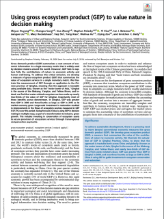 Gross domestic product (GDP) summarises a vast amount of economic information in a single monetary metric that is widely used by decision makers around the world. However, GDP fails to capture fully the contributions of nature to economic activity and human well-being. To address this critical omission, we develop a measure of gross ecosystem product (GEP) that summarises the value of ecosystem services in a single monetary metric. The paper illustrates the measurement of GEP through an application to the Chinese province of Qinghai, showing that the approach is tractable using available data. Known as the “water tower of Asia,” Qinghai is the source of the Mekong, Yangtze, and Yellow Rivers, and indeed, we find that water-related ecosystem services make up nearly two-thirds of the value of GEP for Qinghai. Importantly most of these benefits accrue downstream. In Qinghai, GEP was greater than GDP in 2000 and three-fourths as large as GDP in 2015 as its market economy grew. Large-scale investment in restoration resulted in improvements in the flows of ecosystem services measured in GEP (127.5%) over this period. Going forward, China is using GEP in decision making in multiple ways, as part of a transformation to inclusive, green growth. This includes investing in conservation of ecosystem assets to secure provision of ecosystem services through transregional compensation payments.
