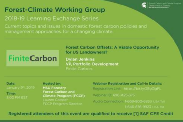 On 9 January 2019 3:00 PM in Eastern Time (US and Canada) Department of Forestry Forest Carbon and Climate Michigan State University is hosting a webinar on "Forest-Climate Working Group 2018-19 Learning Exchange Series".
