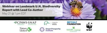 On 21 May 2019 (7:00 PM CET/1:00 PM EDT), Smart Prosperity Institute (SPI), World Wide Fund for Nature (WWF), Canadian Parks and Wilderness Society (CPAWS), Ducks Unlimited, Metcalf Foundation, Nature Conservancy of Canada, and Nature United are holding a webinar on the "Landmark U.N. Biodiversity Report with Lead Co-Author."