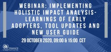 On 29 October 2020 at 09:00 & 15:00 (CET), the United Nations Environment Finance Initiative (UNEP FI) is hosting a webinar on 'Implementing Holistic Impact Analysis- Learnings of Early Adopters, Tool Updates and New User Guide'.